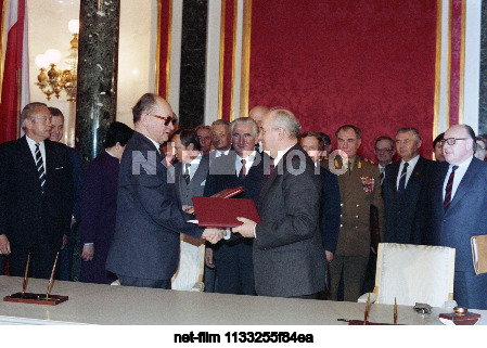СССР. Москва. Генеральный секретарь ЦК КПСС, президент СССР Михаил Сергеевич Горбачев и президент Республики Польша Войцех Ярузельский (справа налево на первом плане) во время торжественной церемонии подписания декларации по результатам советско-польских переговоров в Кремле. Владимир Мусаэльян, Валентин Соболев/ТАСС