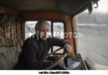 1-24 февраля 1983 г. СССР. Читинская область. Водитель немецкого самосвала "Магирус" специализированного строительно-монтажного поезда "Казахбамстрой" Н. Д. Буй, работающий на строительстве поселка Новая Чара на центральном участке Байкало-Амурской магистрали. Точная дата съемки не установлена. Григорий Калачьян, Леонид Свердлов/ТАСС