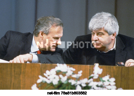 12 -15 декабря 1991 г. Россия. Москва. Мэр Санкт-Петербурга Анатолий Александрович Собчак и мэр Москвы Гавриил Харитонович Попов (слева направо) на учредительном съезде Движения демократических реформ в киноконцертном зале "Россия". Точная дата съемки не установлена. Анатолий Морковкин/ТАСС