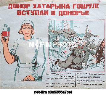 Россия. Можайск. Агитационный плакат серии "Окна ТАСС. Туркментаг" "Вступай в доноры", 1942 год. "Окна ТАСС" – серия плакатов Телеграфного Агентства Советского Союза, выходивших в крупных городах СССР в годы Великой Отечественной войны. Они были призваны поднять боевой дух солдат, в ярких и простых образах укрепить веру народа в неизбежность победы над врагом. Над рисунками работали лучшие художники-карикатуристы и литераторы страны. Первые плакаты появились в Москве 27 июня 1941 года в витринах магазинов на Кузнецком мосту. С 1942 года начался выпуск "партизанских "Окон ТАСС" малого формата, более подходящих для распространения на оккупированных территориях. Плакат из коллекции Национального фондохранилища Российской книжной палаты. Вячеслав Прокофьев/ТАСС