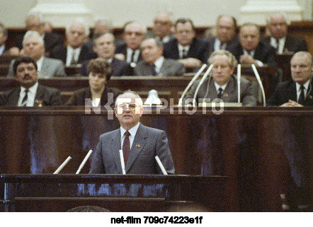СССР. Москва. Председатель Президиума Верховного Совета СССР, Генеральный секретарь ЦК КПСС Михаил Сергеевич Горбачев (на первом плане) во время выступления на совместном заседании Совета Союза и Совета Национальностей в ходе внеочередной X сессии Верховного Совета СССР одиннадцатого созыва в Большом Кремлевском дворце. Юрий Лизунов, Владимир Мусаэльян/ТАСС