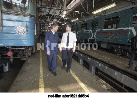 Россия. Москва. Машинисты электродепо "Северное" Московского метрополитена во время презентации поезда "Курская дуга", запущенного в честь работников Московского метро, которые сражались в составе бронепоезда "Московский метрополитен" на Курской дуге и в ознаменование 58-й годовщины Победы в Великой Отечественной войне. Олег Булдаков/ТАСС