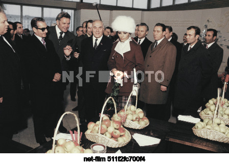СССР. Эстонская ССР. Председатель Президиума Верховного Совета ЭССР Артур Павлович Вадер, шахиншах Ирана Мохаммед Реза Пехлеви (слева направо на первом плане) и супруга шахиншаха Ирана шахиня Фарах Пехлеви во время посещения Эстонского научно-исследовательского института земледелия и мелиорации в поселке Саку. Алексей Стужин/ТАСС