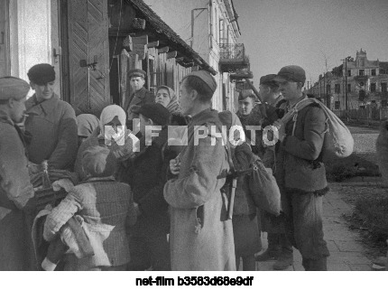1944 г. СССР. Белорусская ССР. Августов. Мирные жители и советские солдаты на одной из улиц города после его освобождения от немецко-фашистских захватчиков во время ВеликойОтечественнойвойны. Точная дата съемки не установлена. Эммануил Евзерихин/ТАСС